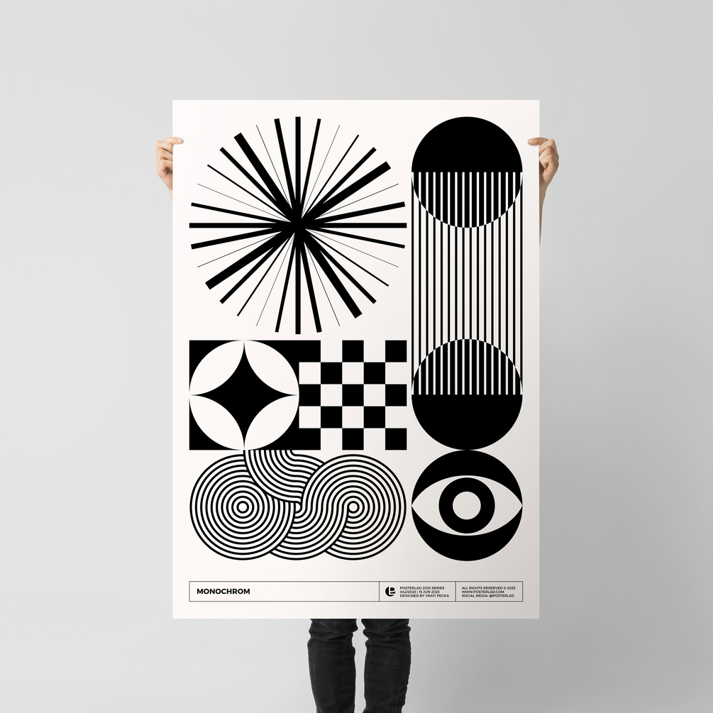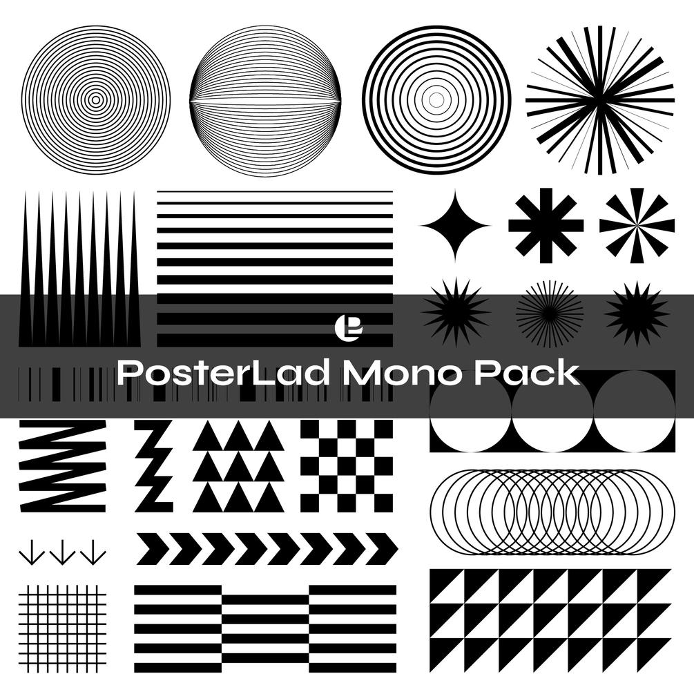 Create amazing monochromatic artworks with PosterLad's shape pack. You will receive .ai and .indd files with 24 different shapes to work with.